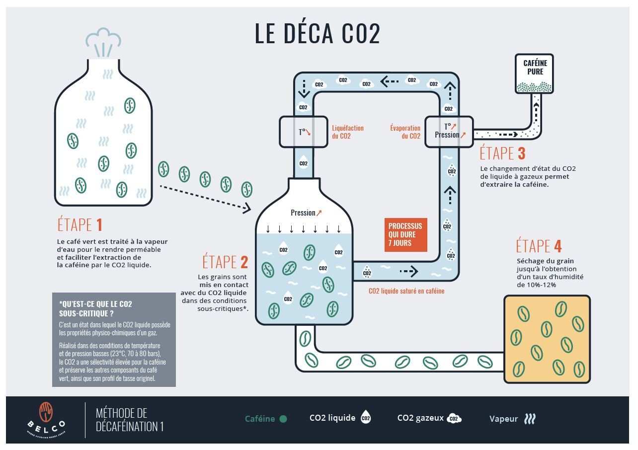 En effet, dans ces conditions particulières, le CO2 avec ses propriétés spécifiques, entre gaz et liquide, lui permettra de pénétrer profondément dans les grains de café vert (état gazeux) et de dissoudre entre 97 et 99% la caféine (état liquide).