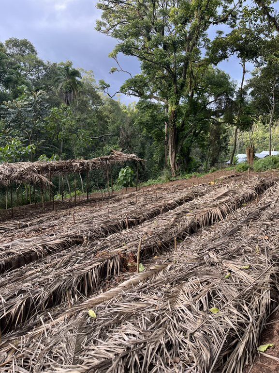 The seeds are planted in beds, and the beds are covered with grass to help retain moisture. The seedlings are watered regularly, and weeded as needed.