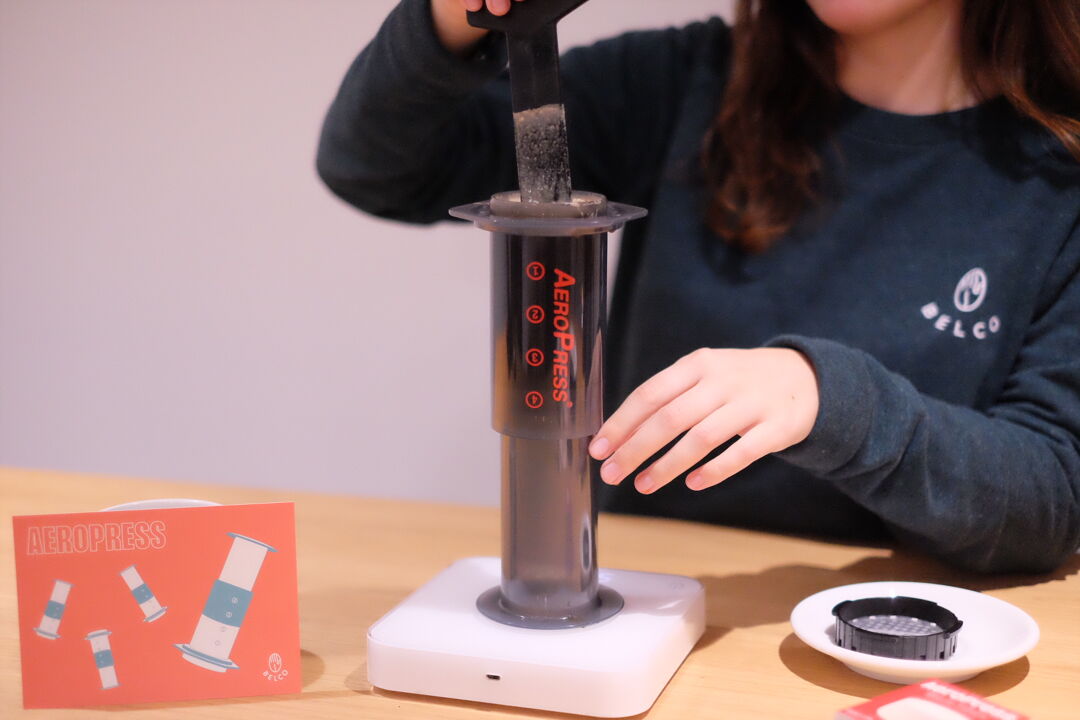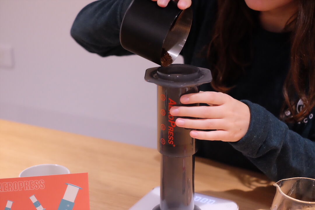 Pour the coffee into the Aeropress, followed by the 220g of water, stir with a spatula to mix and start the timer!